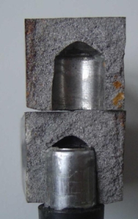 - Eines der Bruchstücke des Hammers trifft den Benutzer. Die Wahrscheinlichkeit dieses Ereignisses wird mit 1/10 angegeben. Es wird angenommen, dass die Fläche des Oberkörpers, die den weggeschleuderten Bruchstücken ausgesetzt ist, 1/10 der vor der Wand liegenden Halbkugel entspricht. Je näher der Benutzer an der Wand steht, desto größer natürlich auch der Teil der Halbkugel, den er mit seinem Körper einnimmt und desto höher die Wahrscheinlichkeit.